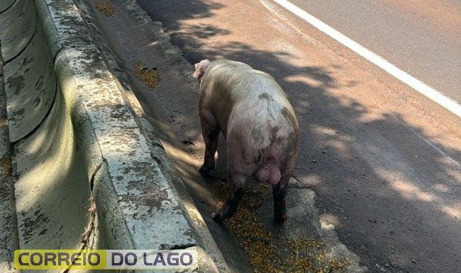 Na última terça-feira (29) uma situação inusitada como esta havia sido registrada na BR 163, em Cascavel, onde um porco foi encontrado perambulando pela via após também possivelmente ter caído de um caminhão de transporte de animais.