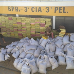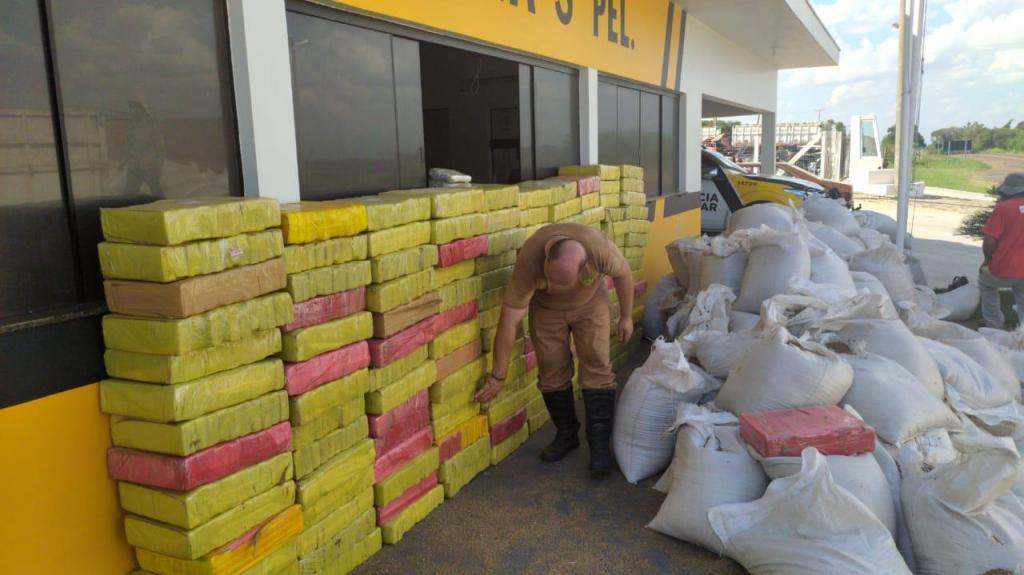 Diante do nervosismo do condutor, foi feita uma revista minuciosa na carga e após tirar alguns sacos com sementes, foi constatado que em seu interior continha fardos de “Maconha” envoltos com fita adesiva.