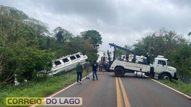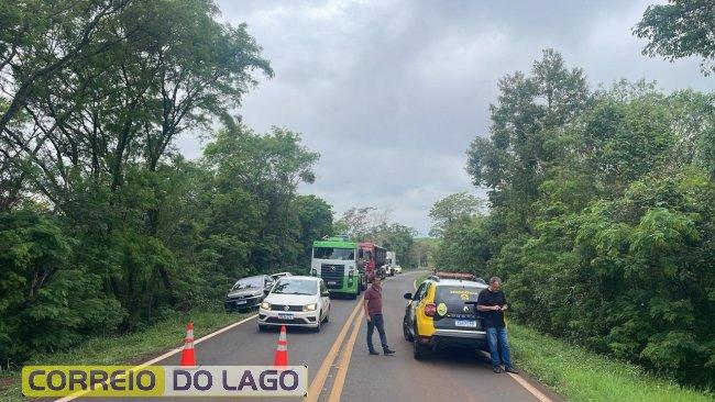A rodovia PR-488 permaneceu totalmente interditada no trecho da Ponte Queimada, limite entre os municípios de Santa Helena e Diamante do Oeste, nesta quarta-feira (1º), para a remoção de um caminhão tombado. A interdição começou às 14h40.
