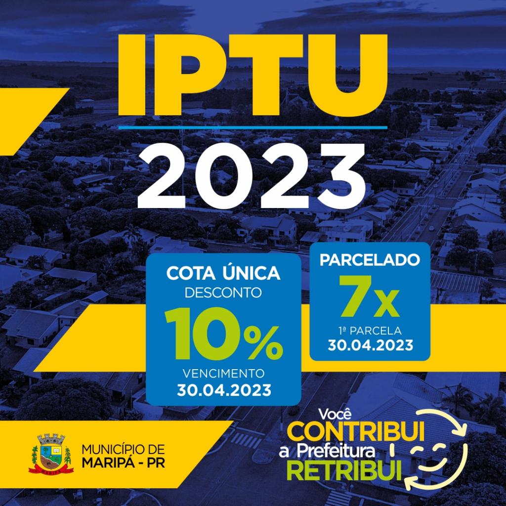 O prazo para o pagamento à vista do Imposto Predial e Territorial Urbano (IPTU) de Maripá termina neste domingo (30). Em razão feriado do dia 1º, Dia do Trabalho, os contribuintes devem retirar o carnê até sexta-feira (28) na Prefeitura e nas Subprefeituras dos distritos de Candeia e Pérola Independente.