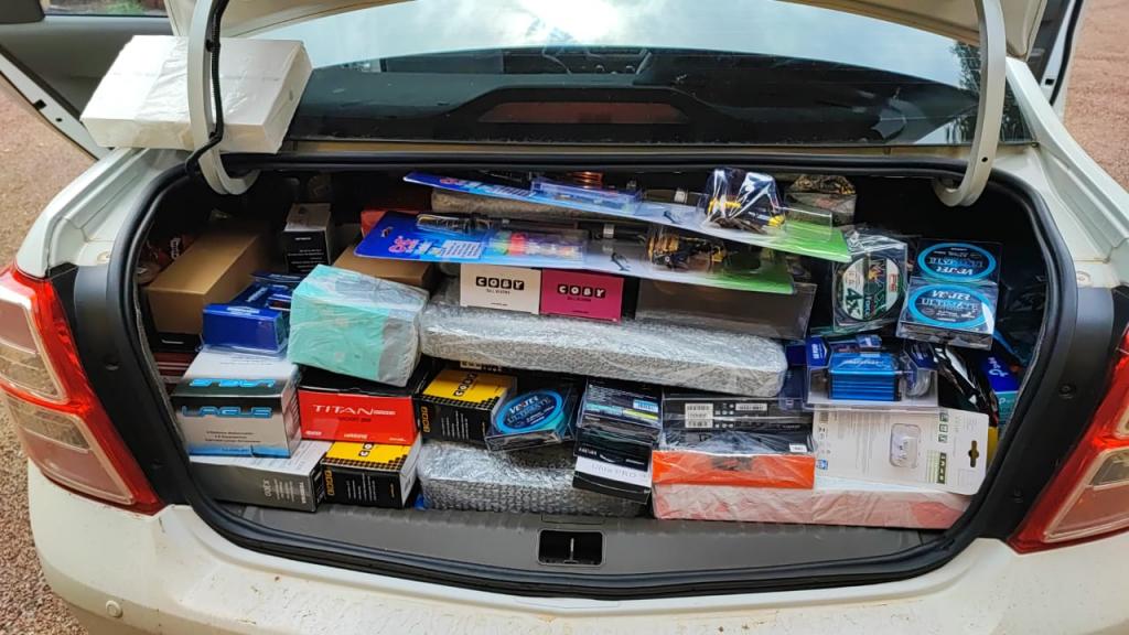 Foram encontrados no carro:Ipads e Celulares, que seguem discriminadas: - Drone DJI Mine 2 SE - Ipad - Mac Bock - Apple Watch - Apple Pencil - Redmi 12C - Note 11 PRO - Note 11 S - Note 11 - Note 10 S - Note 10A - Redmi 9I - Poco XS - Moto G22 - Moto G30 - Redmi A1 - GO PRO - Fones de Ouvido - HD - Placa de Vídeo - Alto Falante - Perfumes - Módulo - Toca CD - Multimidia Idea - Câmera Cano EOS R7. Dentre outros aparelhos eletrônicos, cartões de memória e artigos de pesca.
