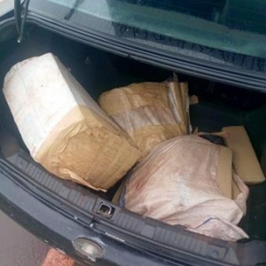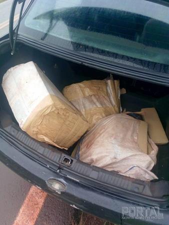 Após busca no veículo foi localizado no interior do porta malas 03 (três) fardos maconha (cannabis sativa), que após contados e pesados totalizou 65 tabletes, pesando 73,500 Kg (setenta e três quilos e quinhentos gramas).