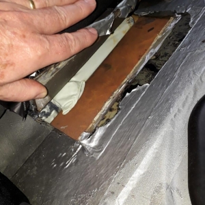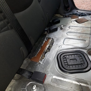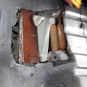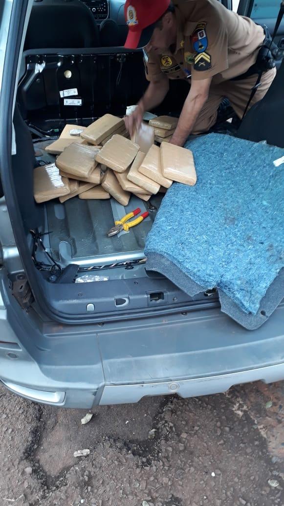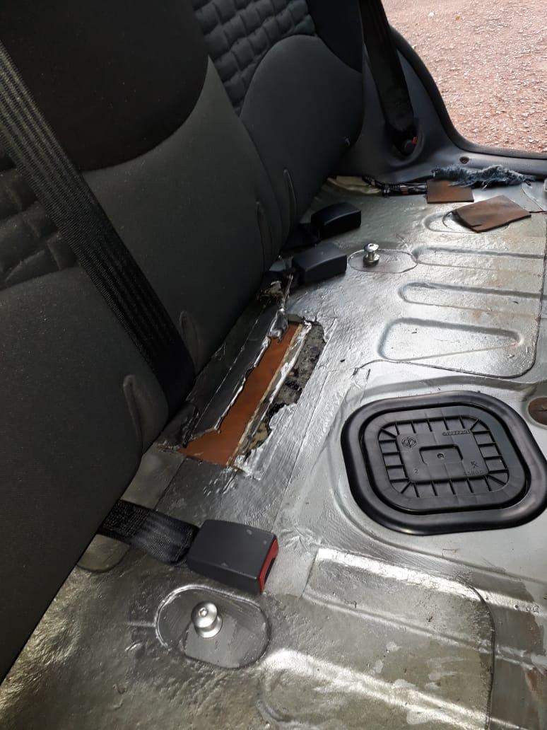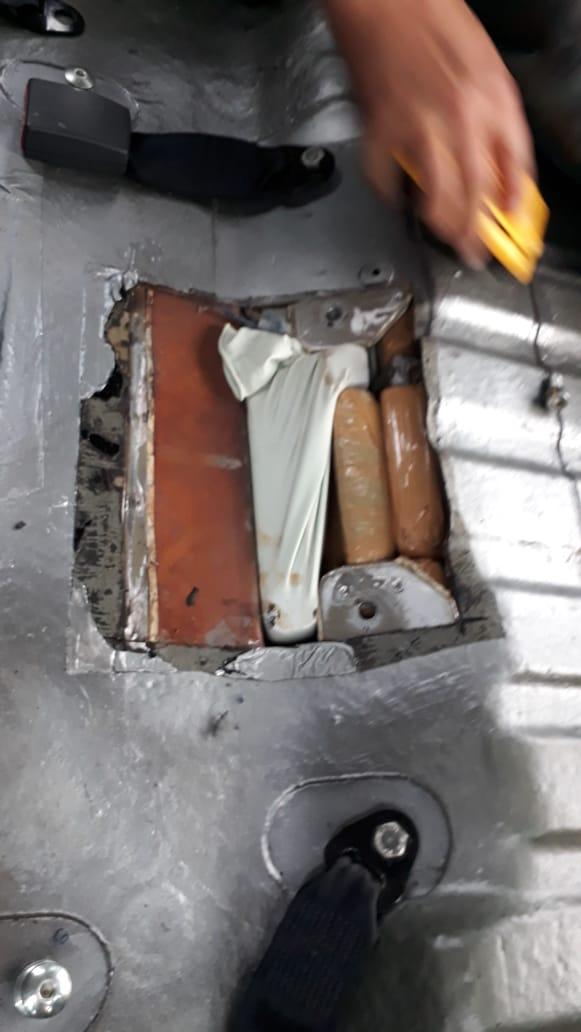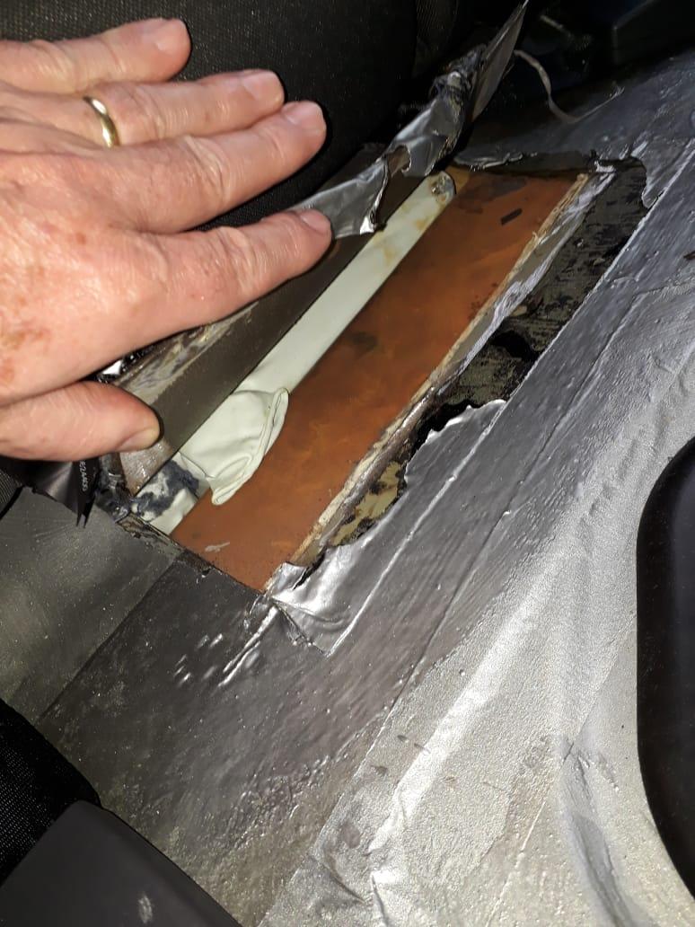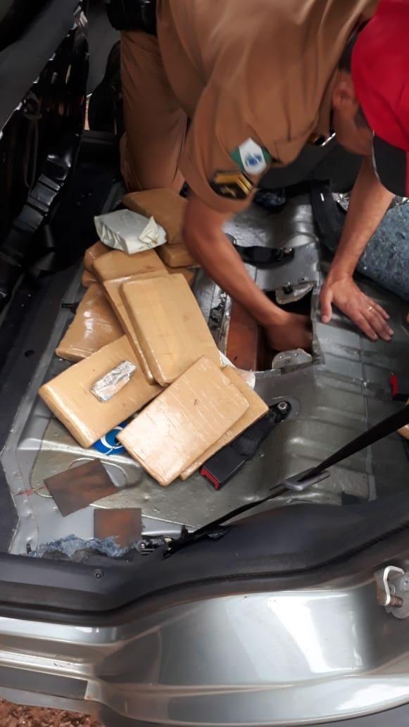 A equipe vistoriou e identificou em um fundo falso a quantidade de 37 tabletes de maconha que após pesados totalizaram 26,065Kg.