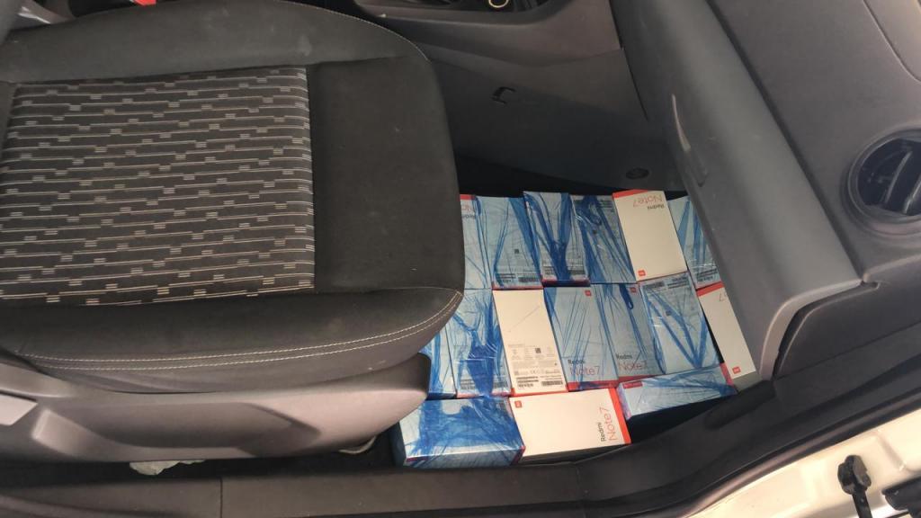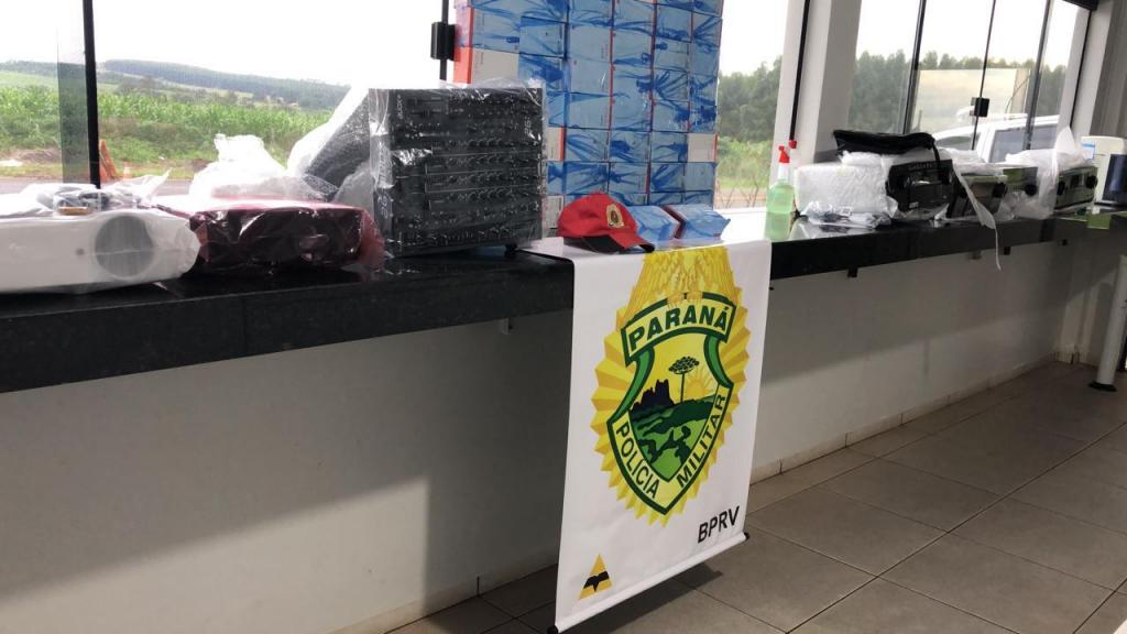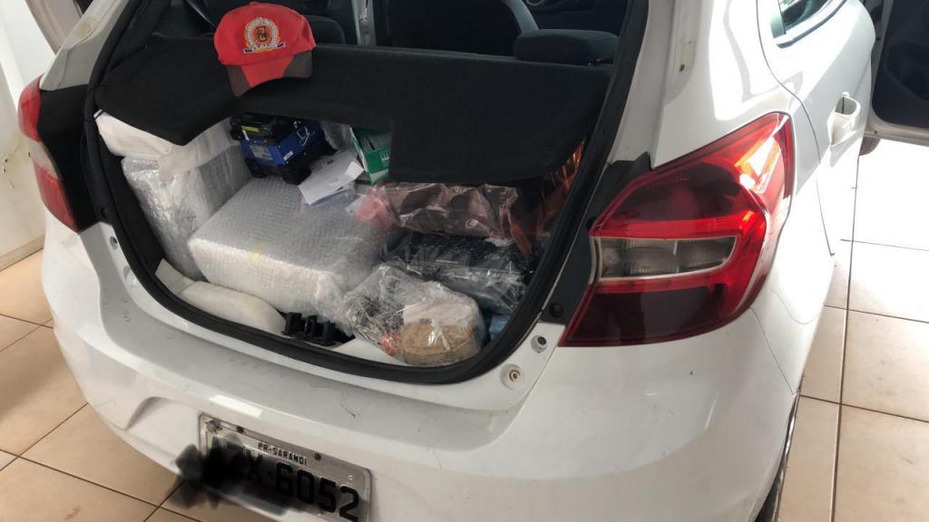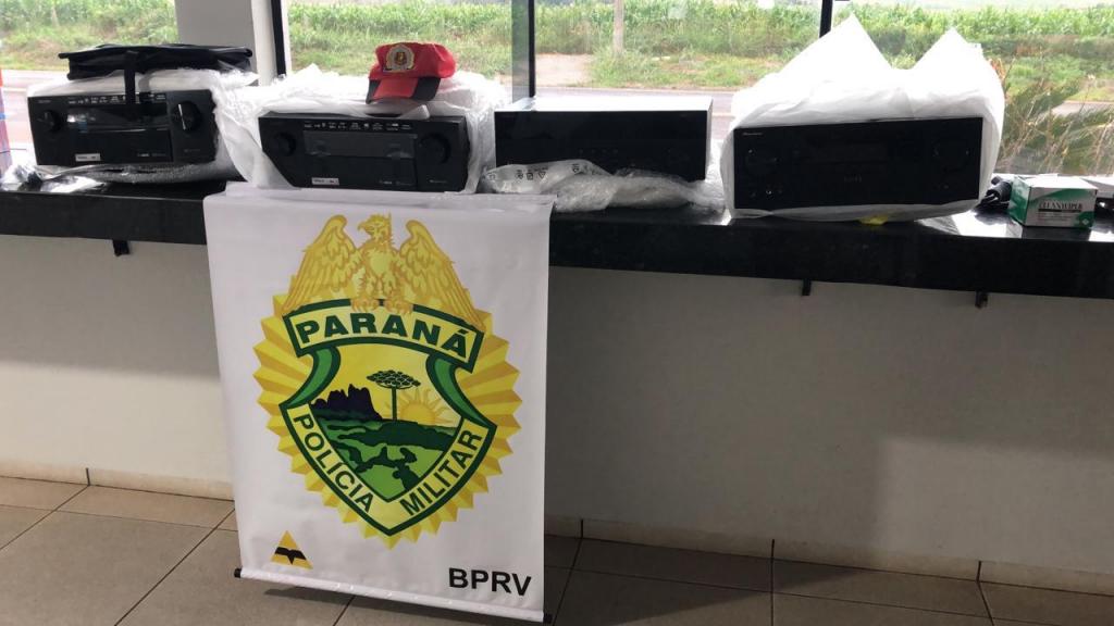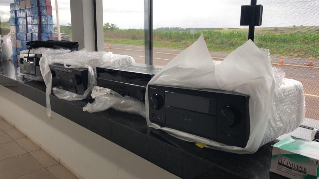 Foi vistoriado o interior do veículo onde foi localizado vários tipos de eletrônicos no valor aproximado de R$ 60.000,00 (sessenta mil reais) em aparelhos celulares, retroprojetores, mesa de som e home theater, possivelmente compradas no Paraguai.