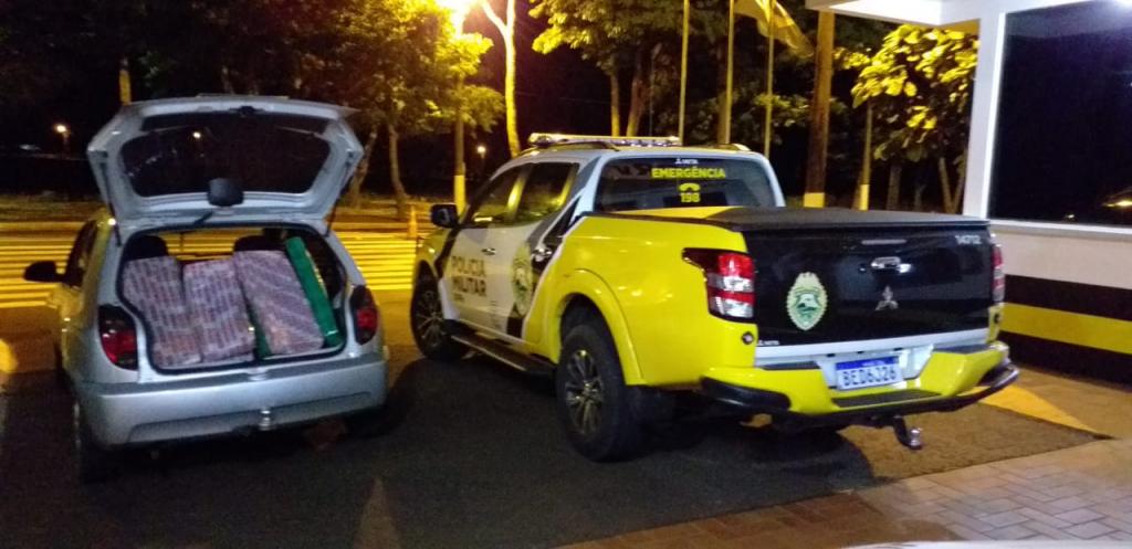 Na madrugada desta quinta-feira por volta das 02h30, durante atendimento de acidente na rodovia PR-488 Km 49, Zona Rural de Diamante do Oeste, policiais rodoviários abordaram um automóvel GM/Celta, que passava pelo local com dois ocupantes, de modo que durante vistoria no interior do veículo, foi encontrado no bagageiro e no banco traseiro, 12 (doze) fardos e 17 (dezessete) tabletes da droga conhecida como maconha, que após pesados totalizaram 138,400 Kg (cento e trinta e oito quilos e quatrocentas gramas).