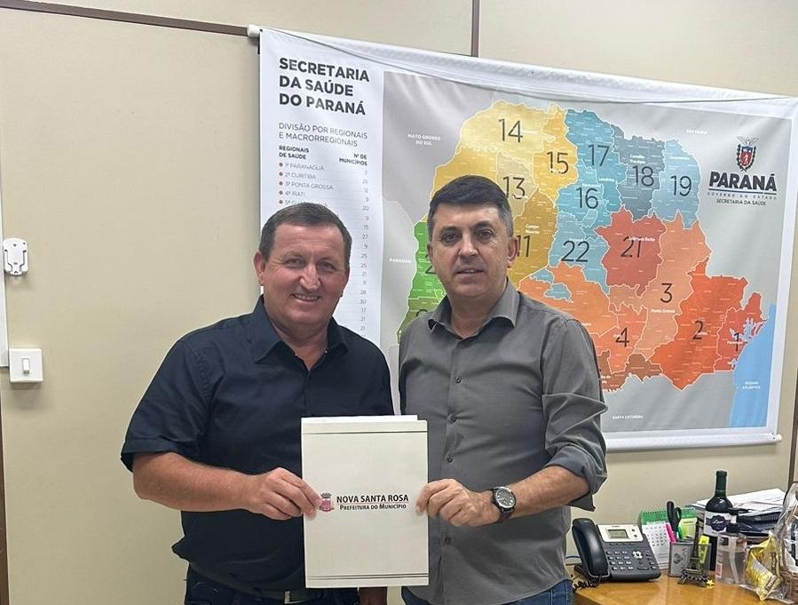 - No gabinete do Secretário de Estado de Saúde, Beto Preto, foi recebido pelo assessor, Silvio Sanches. Na ocasião, protocolou um pedido para aquisição de um centro de imagem (raio-X) para ser utilizado no atendimento da população de Nova Santa Rosa. A expectativa é que ocorra a liberação e doação do equipamento que será destinado a saúde pública do município.
