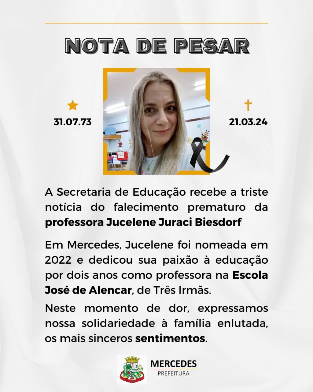 É com profundo pesar que a Prefeitura de Mercedes, por meio da Secretaria de Educação e Cultura, recebe a triste notícia do falecimento prematuro da professora Jucelene Juraci Biesdorf, aos 51 anos de idade, ocorrido nesta quinta-feira (21).