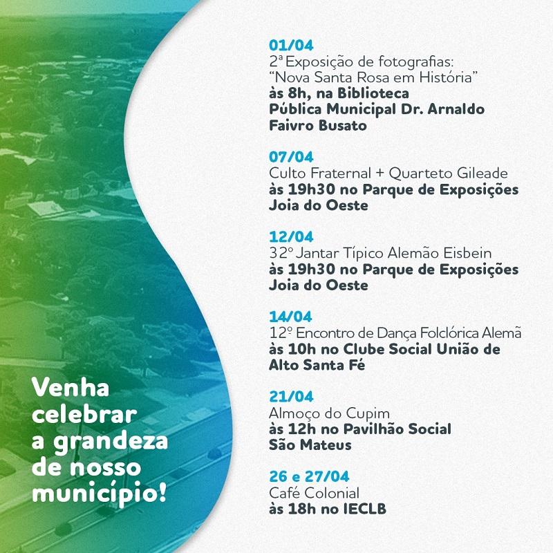 A programação é extensa e será realizada durante todo o mês de abril. São eventos que incluem diversas áreas: cultura, educação, esporte, assistência social, saúde, comércio e empreendedorismo, entre outras. Os shows com entrada gratuita são o grande destaque da programação, assim como a 18ª ExpoRosa e 13ª Expo MEI’s que contará com a exposição da Indústria e Comércio do município.