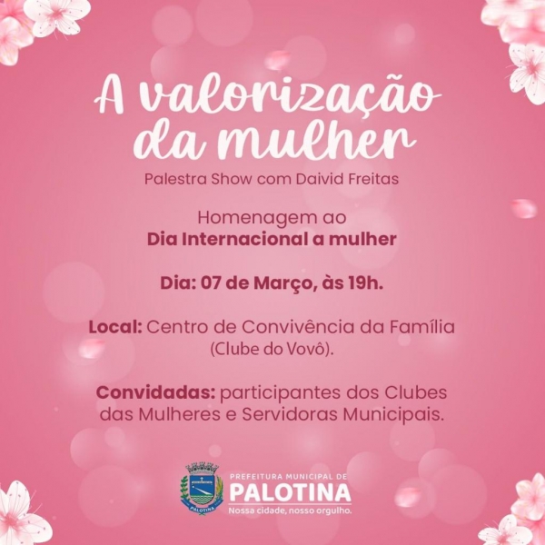 A Prefeitura Municipal, por meio da Secretaria da Assistência Social de Palotina está promovendo uma palestra show com Daivid Freitas em homenagem ao Dia Internacional da Mulher.