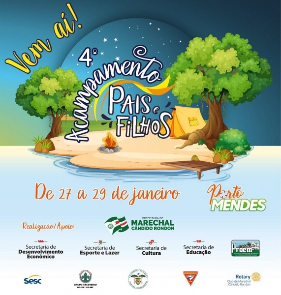 A prefeitura de Marechal Cândido Rondon, através das secretarias de Desenvolvimento Econômico, Esporte e Lazer, Cultura e Educação e Proem (Fundação Promotora de Eventos), com o apoio do SESC, Grupo Escoteiro 25 de Julho, CTG Tertúlia do Paraná, Clube de Desbravadores e Rotary Clube Marechal Cândido Rondon, organiza o 4º Acampamento Pais e Filhos, que acontece de 27 a 29 de janeiro, no parque de lazer de Porto Mendes.