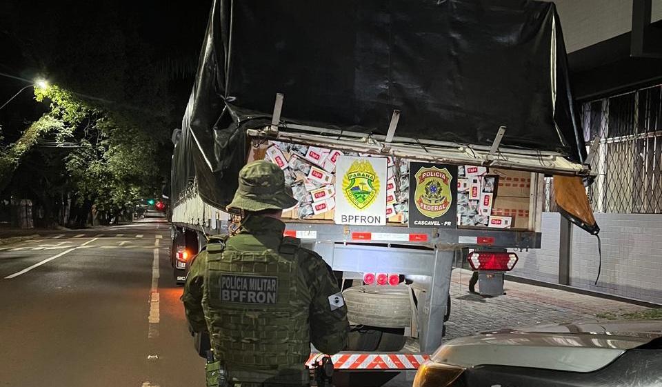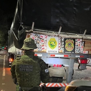 Durante patrulhamento realizado nesta sexta-feira (11), equipes da Polícia Militar do Paraná, por meio do Batalhão de Polícia de Fronteira (BPFron), em ação integrada com a Polícia Federal (PF), apreenderam um carregamento de 40 mil pacotes de cigarros contrabandeados do Paraguai. A apreensão ocorreu na BR-277, entre os municípios de Santa Tereza do Oeste e Cascavel, durante a vigência da Operação Protetor de Divisas e Fronteiras.