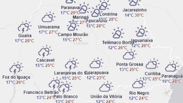 Em Londrina e Apucarana a previsão está na casa dos 15ºC aos 28ºC. Maringá a mínima é de 17ºC e a máxima 27ºC.