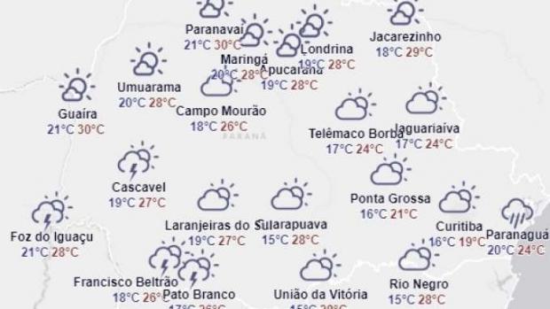 Já nos três municípios ao norte do estado, Maringá, Apucarana e Londrina a máxima será de 28ºC.