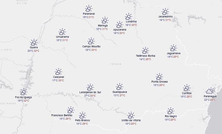Deslocando mais ao norte do estado, em Paranavaí, Maringá e Londrina a máxima prevista não deve passar dos 31ºC.