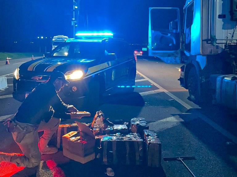 No entanto, quando os policiais abriram a lona do semi-reboque para fiscalizar a carga, encontraram fardos de maconha. Depois, os policiais também encontraram outros pacotes da droga dentro dos pneus de estepe. No total, a equipe da PRF encontrou 280 quilos de maconha no caminhão.
