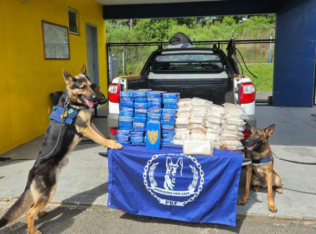 O veículo, conduzido por um homem de 36 anos, foi parado para fiscalização de rotina, com o uso de cães farejadores. Os cães Cronos e Camaro, ainda novatos na PRF, apontaram a presença de ilícitos no veículo. Após a desmontagem da proteção da caçamba, foram localizados 47,4 kg de Cloridrato de cocaína e 36,32 kg de pasta-base para produção de cocaína.