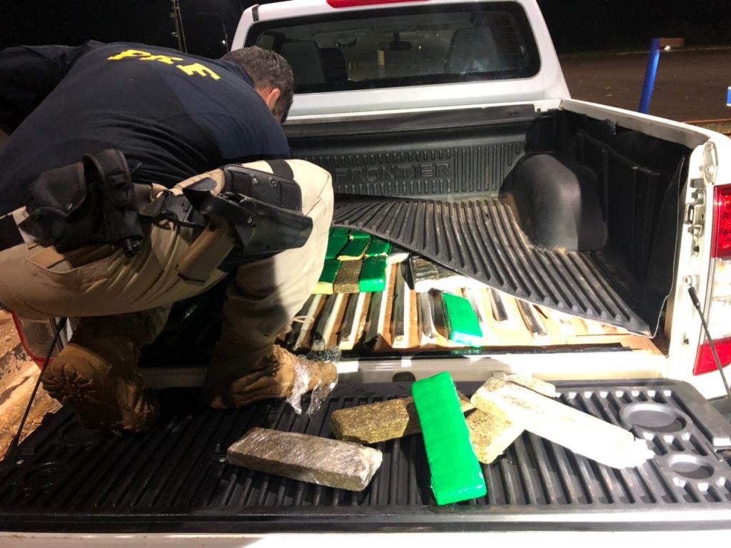 Os policiais iniciaram uma fiscalização mais aprofundada onde foi possível localizar sob o banco traseiro e protetor de caçamba vários tabletes de substância análoga a maconha, que após pesagem totalizou 60,48Kg.