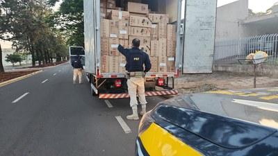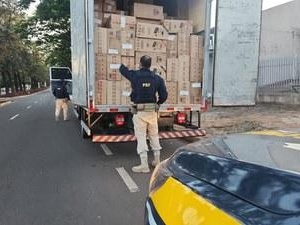 No início da manhã, às 06h30, uma equipe da PRF localizou um caminhão com sinais de adulteração na Avenida Guaiapó, em Maringá (PR). A vistoria revelou que o veículo transportava 150 mil maços de cigarros contrabandeados. O caminhão estava com placas alteradas. Ninguém foi preso. Ocorrência encaminhada à Polícia Federal.