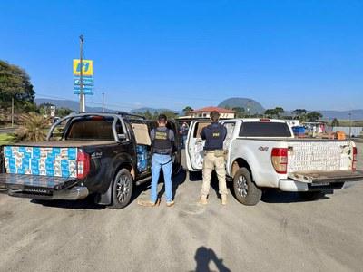 No mesmo horário, outra equipe atuou em conjunto com a Polícia Federal na BR-373, em Prudentópolis, na região centro-sul do Paraná. Os motoristas de duas caminhonetes desobedeceram à ordem de parada e tentaram fugir em alta velocidade, colocando em risco os demais usuários da rodovia. A fuga terminou após alguns quilômetros, em Guamiranga (PR). Dentro dos carros, foram encontrados cerca de 50 mil maços de cigarros. Dois homens, de 35 e 34 anos, foram presos e levados à Delegacia da Polícia Federal em Guarapuava.