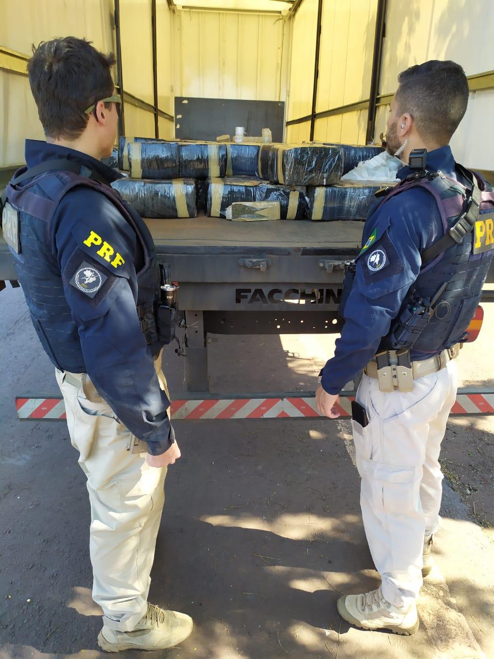 Após buscas, foram localizados aproximadamente 610 kg de maconha no compartimento da cabine do veículo.