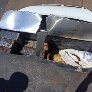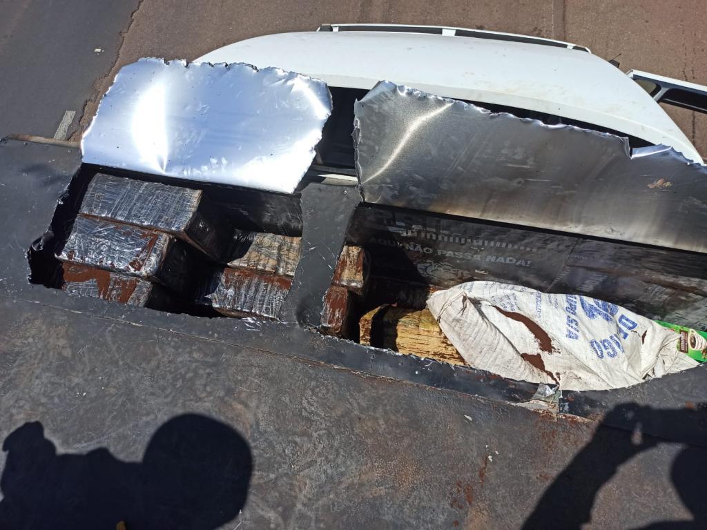 Na parte superior (teto) do baú, os policiais encontraram um fundo falso que, após aberto, dava acesso a uma grande quantidade de maconha. A droga estava em meio a pó de café para despistar fiscalizações policiais.