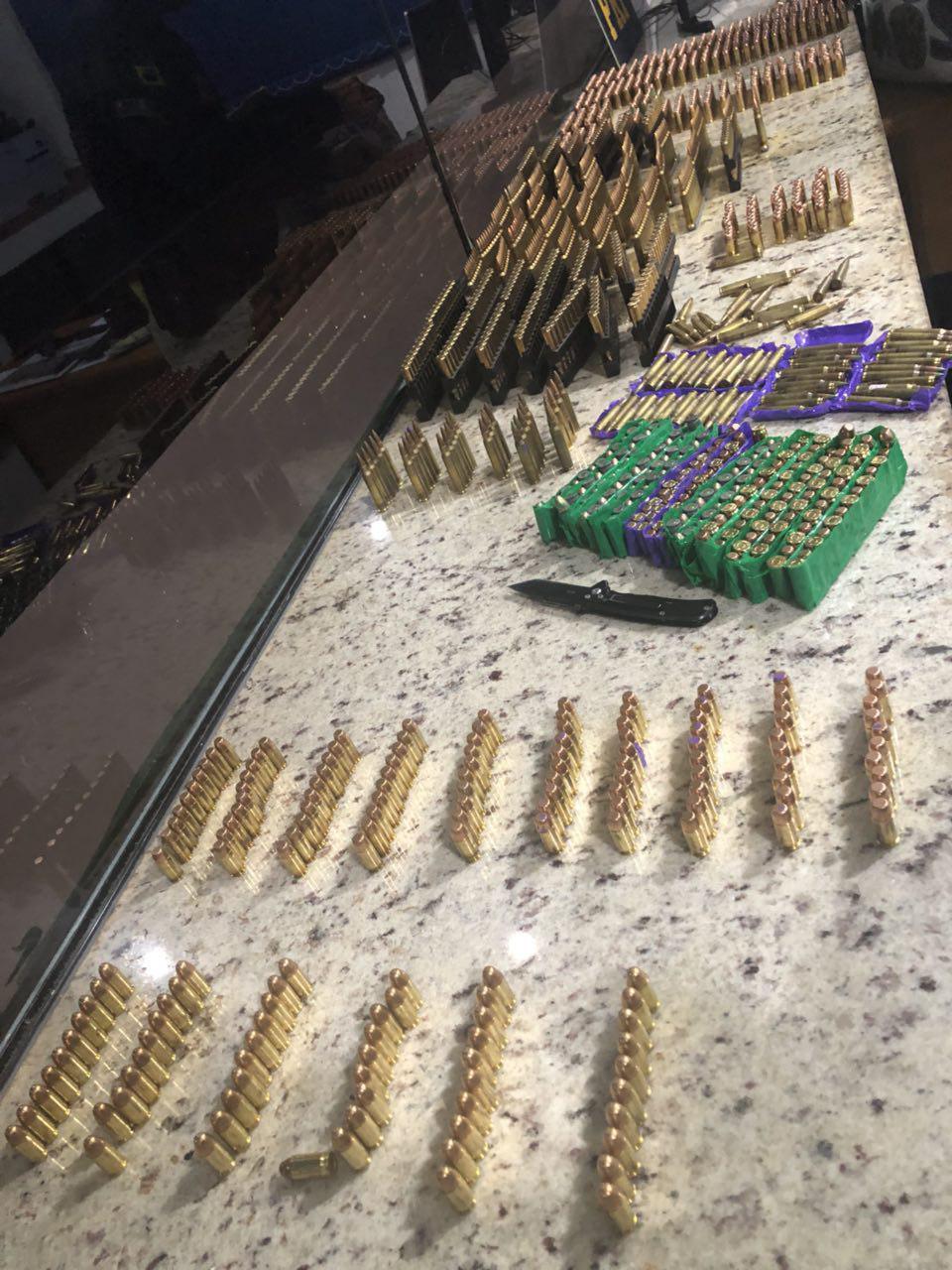 Em razão disso, os policiais iniciaram uma busca minuciosa no carro e encontraram 2.436 munições de diversos calibres, sendo 885 munições de calibre .40; 250 de calibre .45; 600 de fuzil 3,65; 401 de calibre .380 e 300 de calibre 9mm. Ainda, foi encontrado com o motorista a quantia de R$ 1.409,00.