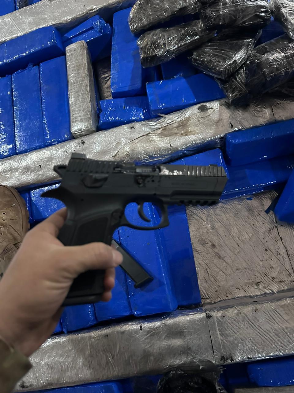 A droga e as armas, de fabricação israelense, estavam escondidas em um fundo falso, no teto de uma carreta frigorífica.