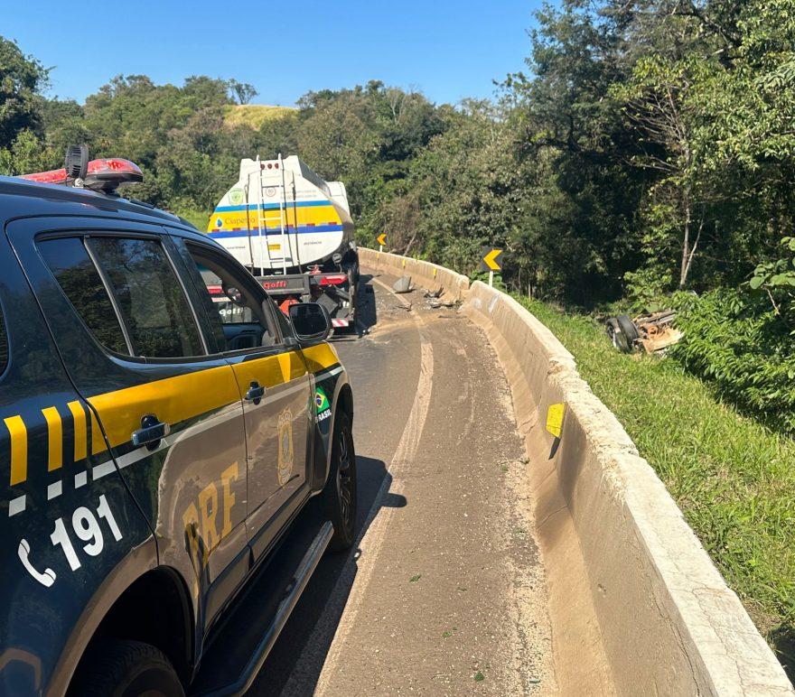 De acordo com as informações preliminares, o veículo Ford Fiesta, que trafegava em sentido crescente, invadiu a faixa contrária e colidiu frontalmente com um caminhão que seguia no sentido oposto. Com o impacto, o Ford Fiesta rodou e saiu da pista, capotando ao passar pela defensa lateral.