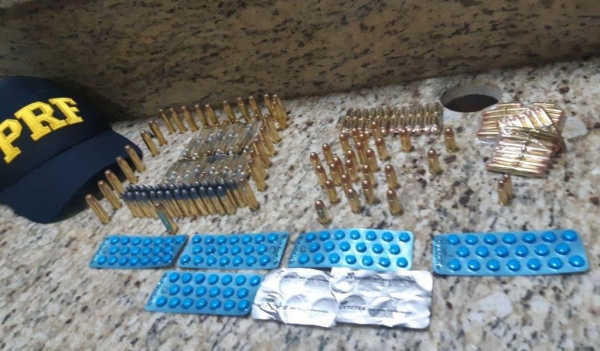 A Polícia Rodoviária Federal (PRF) apreendeu 250 munições, 100 comprimidos de estimulante sexual e dez comprimidos de medicamento abortivo na noite deste sábado (14) em Santa Terezinha de Itaipu, na região oeste do Paraná.