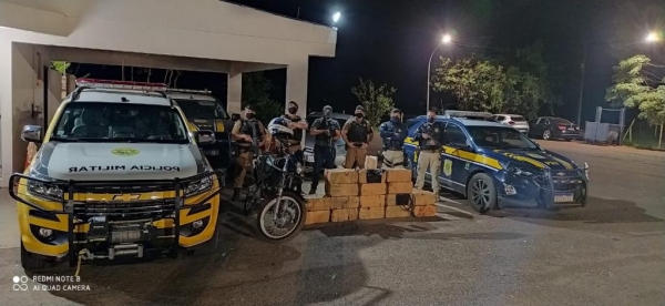Em trabalho conjunto com a PM de Campo Mourão (PR), conseguiram identificar e prender um homem, de 21 anos, que conduzia uma motocicleta Honda/Falcon, de Curitiba (PR) e fazia o serviço de batedor da carga.