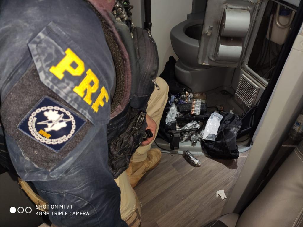 No interior do banheiro do coletivo, foram encontradas 4 bolsas escondidas, contendo 2 pistolas semi-automáticas de origem turca, 11 carregadores para fuzil, 4 carregadores para pistola, e mais de 700 munições utilizadas em armas de grosso calibre, como fuzis automáticos e carabinas.