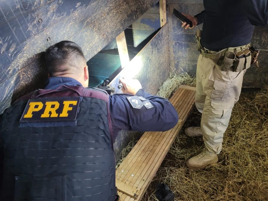 No compartimento de carga, que possuía quatro equinos, foi localizado um fundo falso, e dentro foram encontrados 15 fardos de cocaína, totalizando 508 kg da droga.