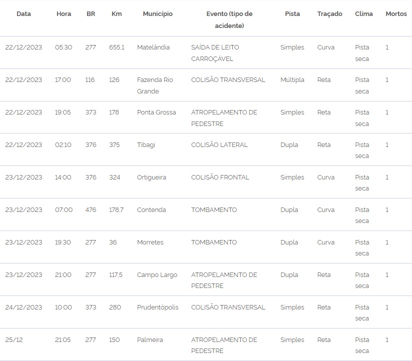 A Polícia Rodoviária Federal no Paraná encerrou às 23h59 de ontem (25), a Operação Natal 2023, iniciada no último dia 22. Usuários mais frágeis nas rodovias (pedestres, ciclistas e motociclistas) foram os mais vitimados.