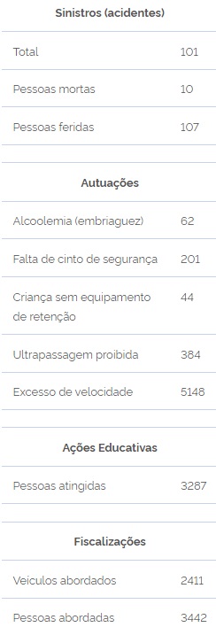 A PRF realizou no período um esforço na fiscalização e na educação de condutores e passageiros, realizando ações de educação em comandos nas rodovias e em terminais rodoviários. 3287 receberam palestras sobre cuidados básicos com a segurança. Quanto a fiscalização, 2411 veículos foram abordados e fiscalizados, com foco nos equipamentos de segurança: cinto de segurança, dispositivo de retenção para crianças e capacete.