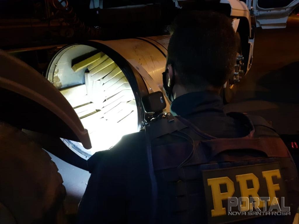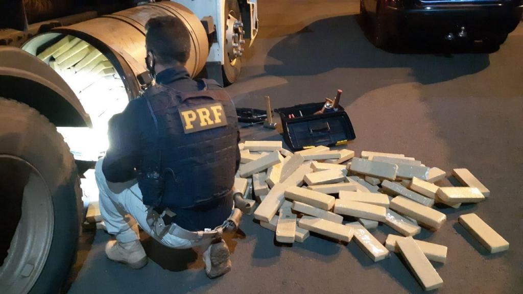 A droga era transportada em um compartimento oculto na cabine e nos dois tanques de combustível de uma carreta, abordada na BR-163. O motorista foi preso em flagrante.