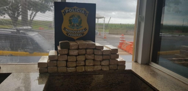 Ao inspecionar o bagageiro do veículo, os agentes federais encontraram em uma das malas 40 tabletes contendo aproximadamente 21,6 Kg de substância análoga à maconha.