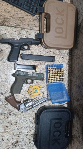 Ao todo, foram apreendidas uma pistola .380, uma pistola 9mm, um revólver calibre 38, 85 munições .380, 85 munições 9mm e seis munições de .38.