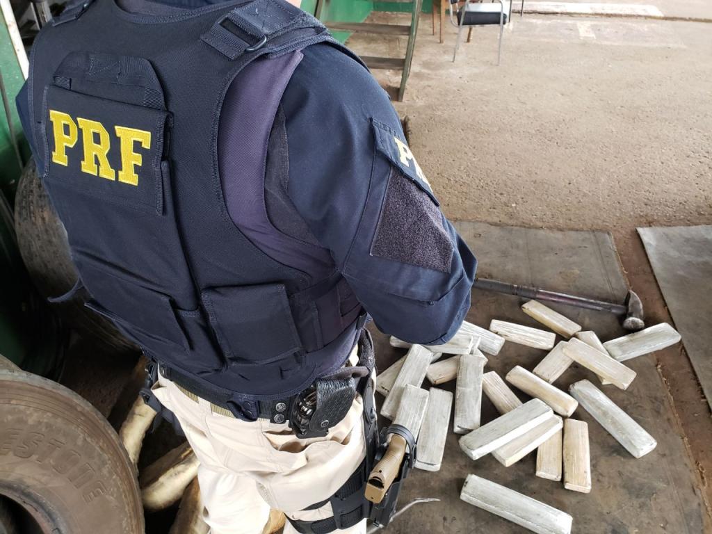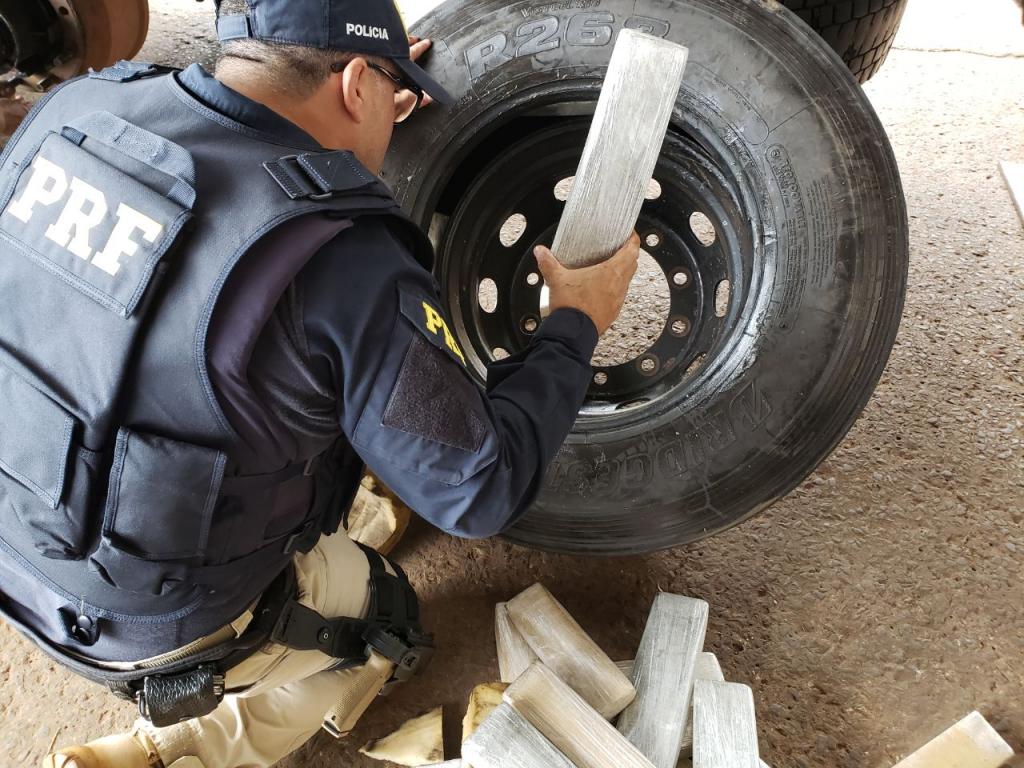 A droga estava nos rodados que estavam levantados do eixo traseiro de um Volkswagen PM1000, abordado por volta das 13h30, na BR-277, em frente à unidade operacional da PRF.