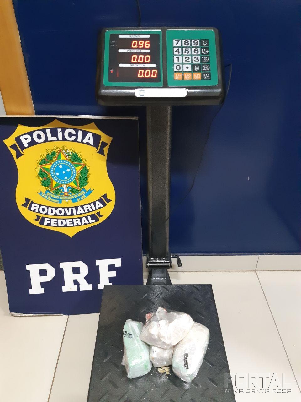 Durante a fiscalização ao veículo foram encontrados quatro pacotes Crack, que após pesagem totalizou 960 gramas, sendo três em bagagem de mão e 01 junto ao corpo da passageira.