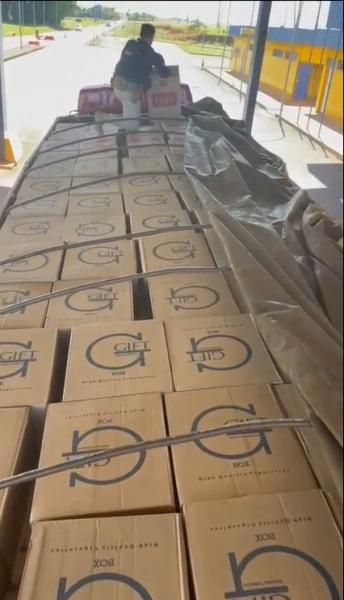 Os policiais abordaram, no perímetro urbano da cidade, uma carreta Scania com placas paraguaias, que estava carregado com cerca de 800 caixas de cigarros, o equivalente a aproximadamente 400 mil maços.