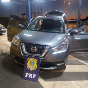 Em consulta ao sistema ficou constatado que o veículo havia sido roubado a poucas horas na cidade de Curitiba e estava com placas falsas.
