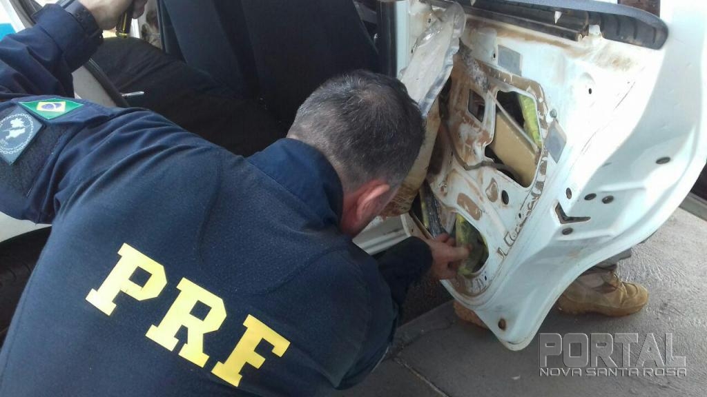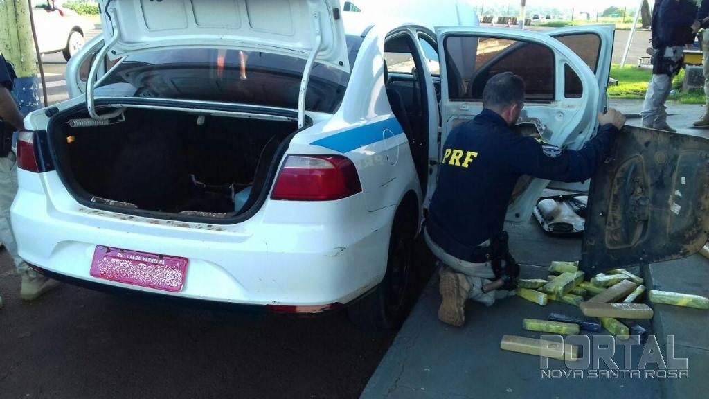 O taxista, de 50 anos de idade, transportava 27,2 quilos de maconha em compartimentos ocultos nas quatro portas de seu veículo, um Volkswagen Voyage.