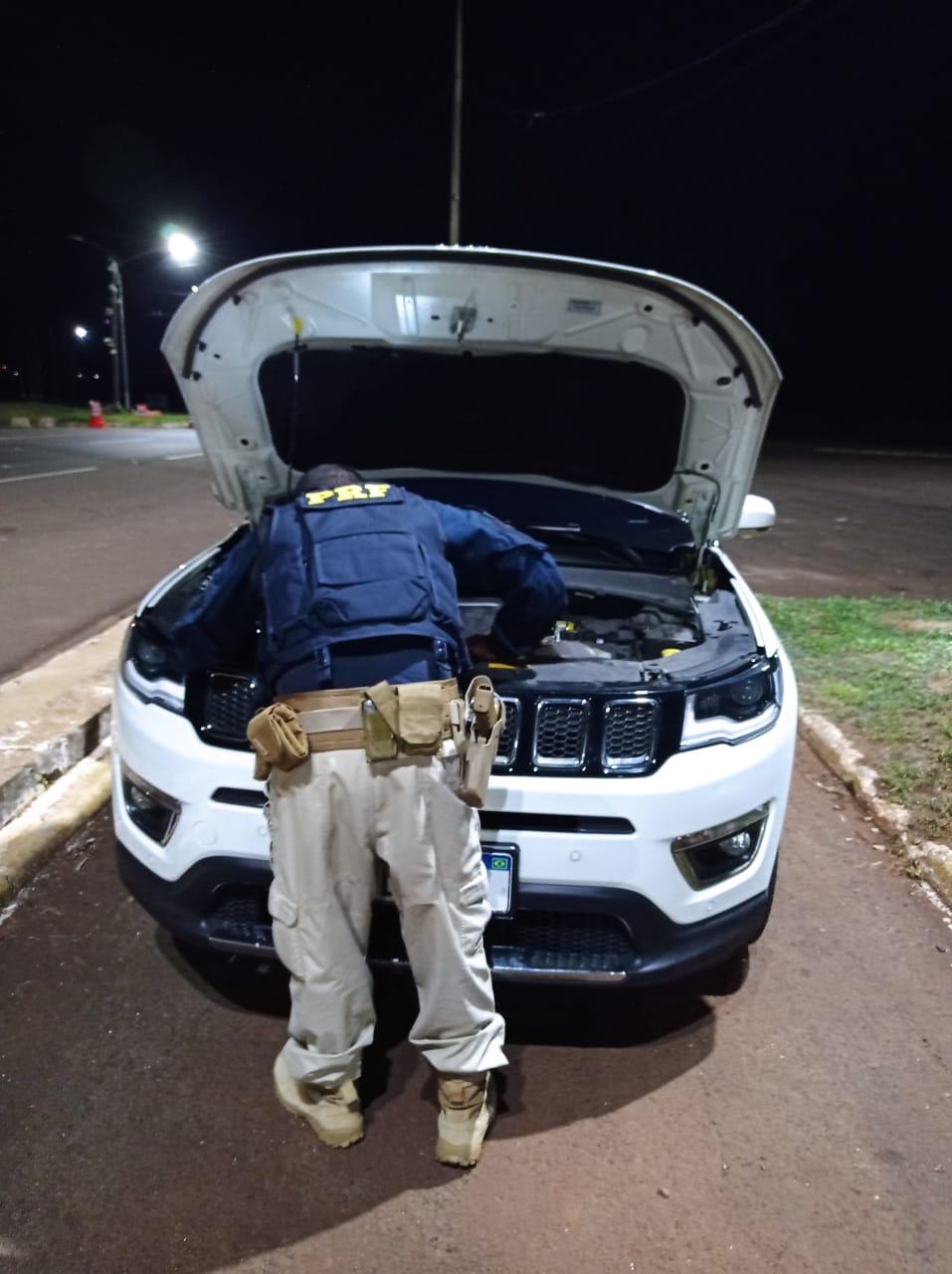 Durante ações de combate ao crime em frente ao posto de fiscalização da Polícia Rodoviária Federal, foi abordado o veículo Jeep Compass Limited, cor branca, placas do Rio de Janeiro.