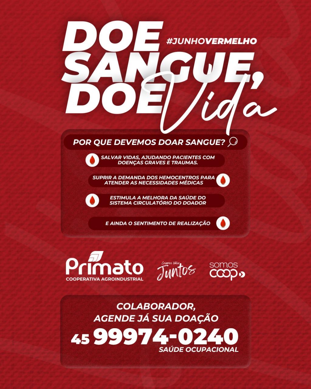 Doar sangue é um ato solidário e quando o assunto é cooperar com o próximo, a Primato está presente, contribuindo para que a Campanha atenda os mais necessitados. Além de ações de arrecadações de agasalhos e alimentos não perecíveis desenvolvidas atualmente junto ao SESC e as Cooperativas da cidade de Toledo, a Primato ainda está presente no apoio a Campanha Junho Vermelho.