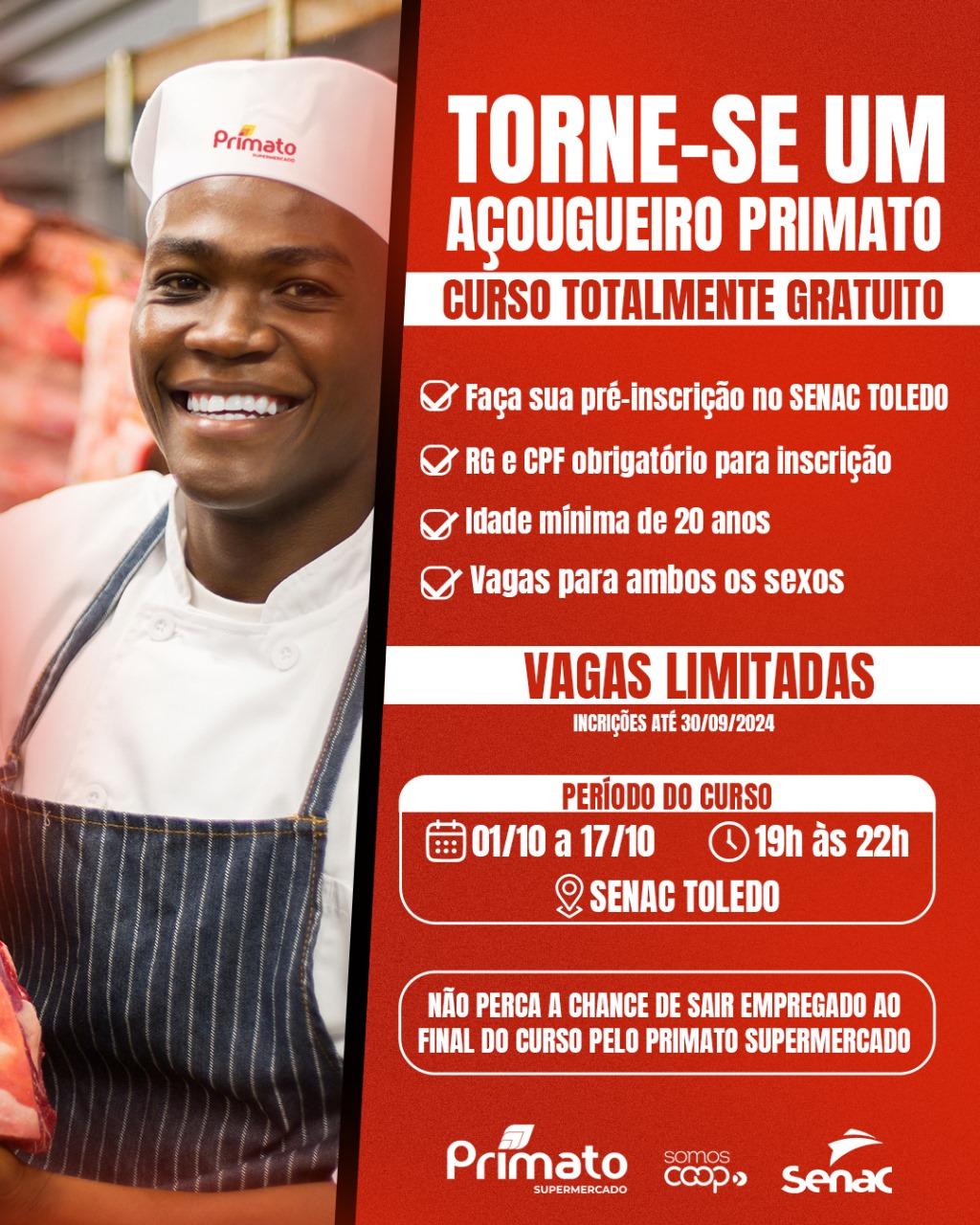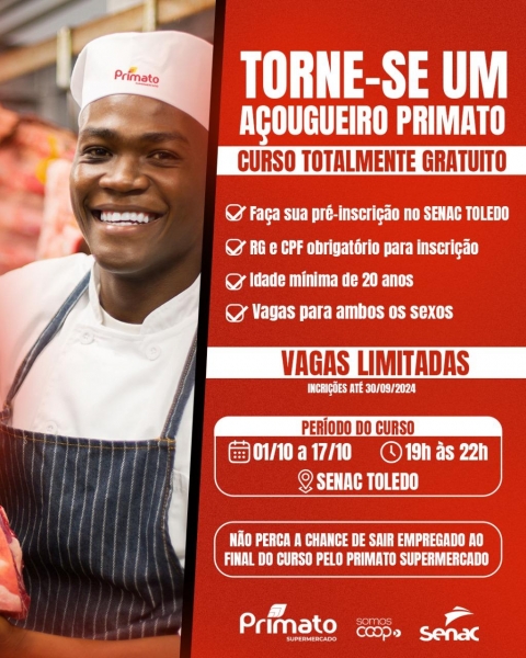A Cooperativa Primato Agroindustrial e o SENAC (Serviço Nacional de Aprendizagem Comercial) estão juntos na realização do seu projeto pessoal e profissional ao oferecer o Curso de Açougueiro de forma gratuita.