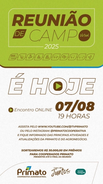 A Primato Cooperativa Agroindustrial realiza nesta quinta-feira, 07 de agosto, às 19h, a Reunião de Campo virtual para prestação de contas referente ao primeiro semestre de 2025.