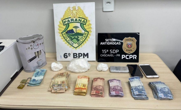 A Polícia Civil de Cascavel, com o apoio da Polícia Militar, realizou na tarde de segunda-feira (10), uma significativa apreensão de cocaína. Após um meticuloso trabalho de investigação, os agentes efetuaram buscas e conseguiram apreender uma quantidade considerável da droga, além de dinheiro trocado e uma balança de precisão.