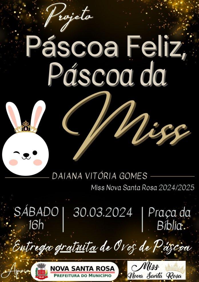 A Miss Nova Santa Rosa, Daiana Vitória Gomes, está realizando o projeto “Páscoa Feliz, Páscoa da Miss”. O objetivo é ofertar, proporcionar, despertar e resgatar de forma natural e espontânea, as manifestações expressivas da Páscoa, do verdadeiro sentido que é a ressurreição de Cristo; valorizar a religiosidade e oportunizar momento lúdico, que é a entrega voluntária de ovos de Páscoa.