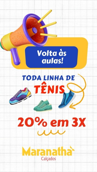 A Maranatha Calçados de Nova Santa Rosa está com a promoção Volta as Aulas, toda a linha de tênis com 20% de desconto e você ainda pode pagar em até três vezes.