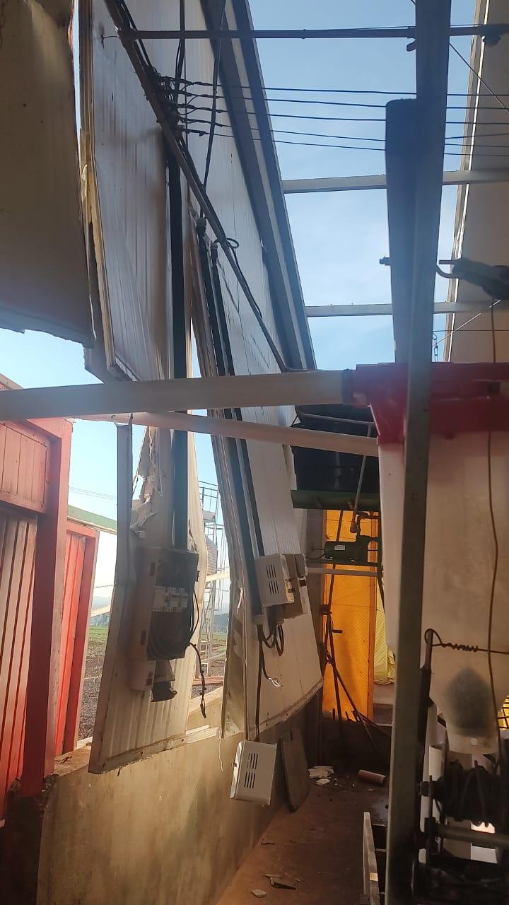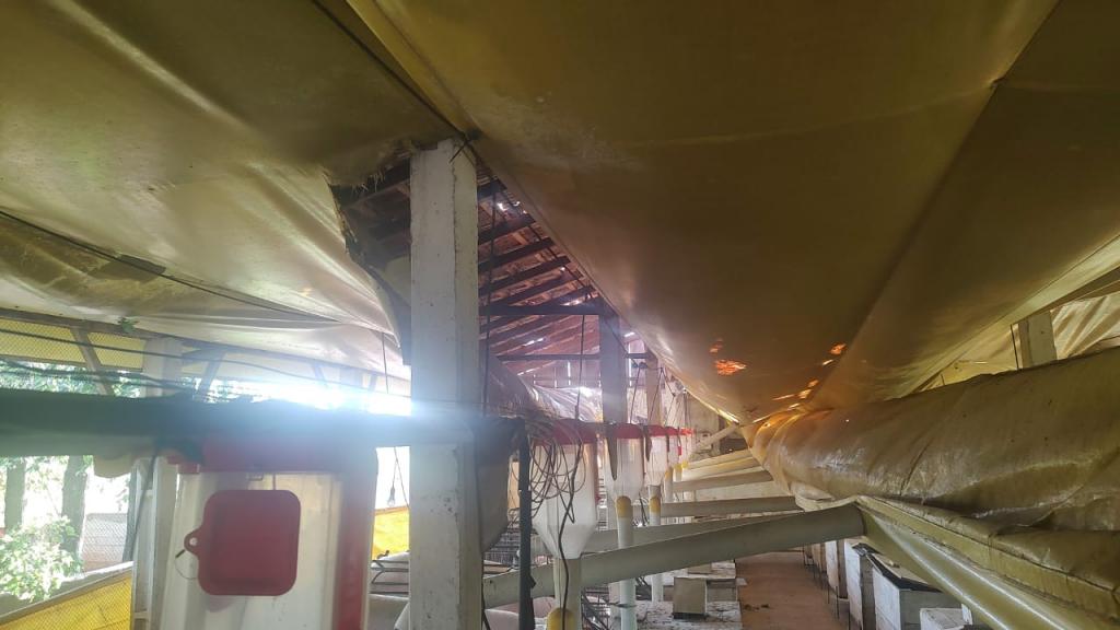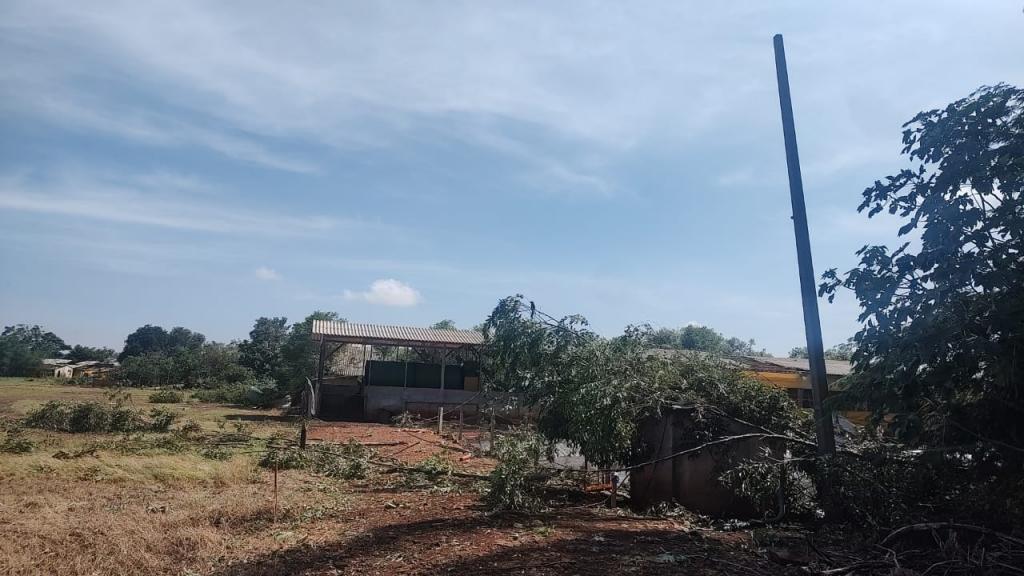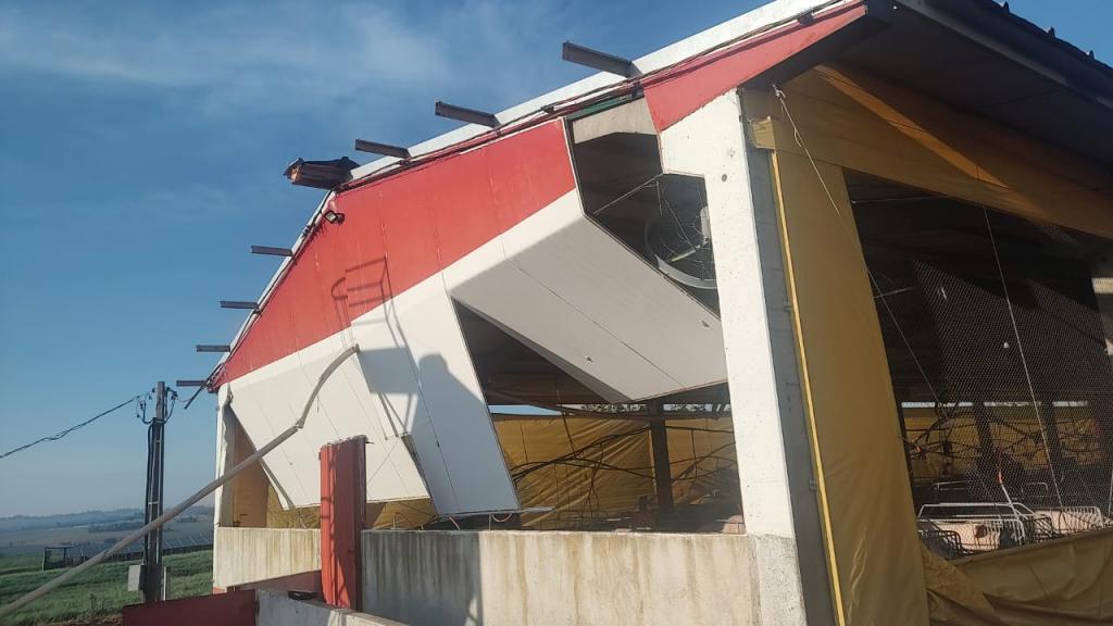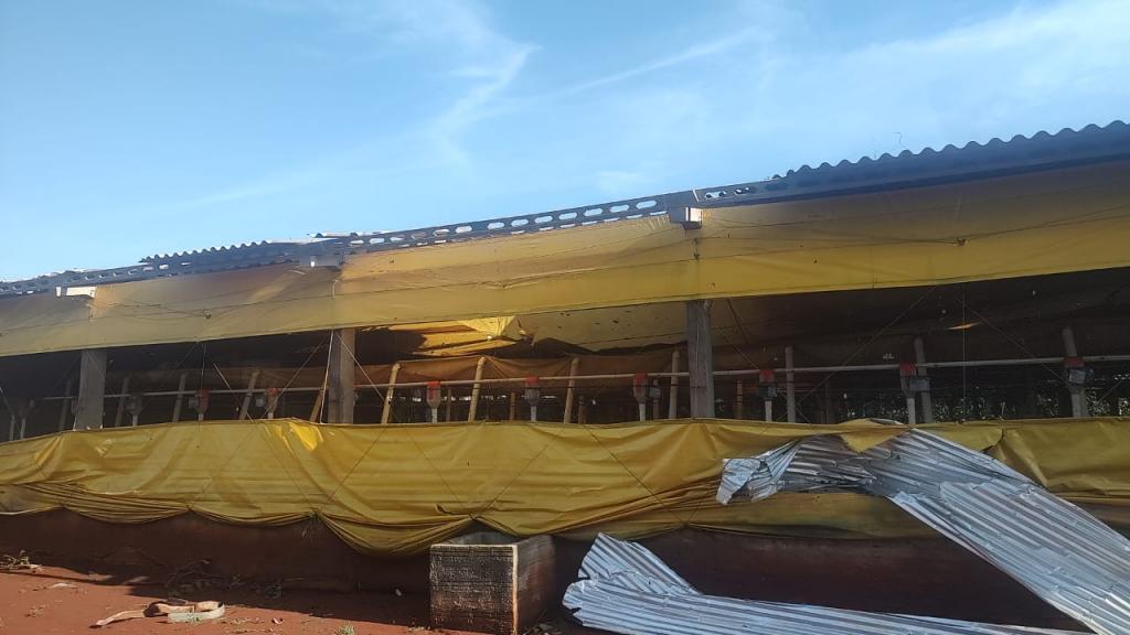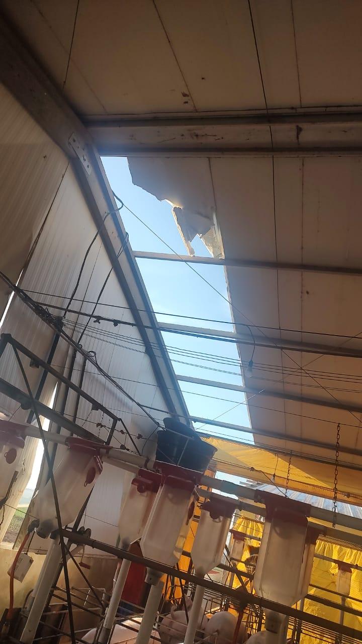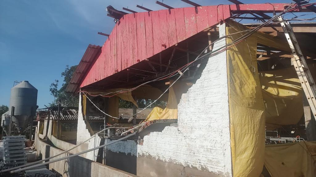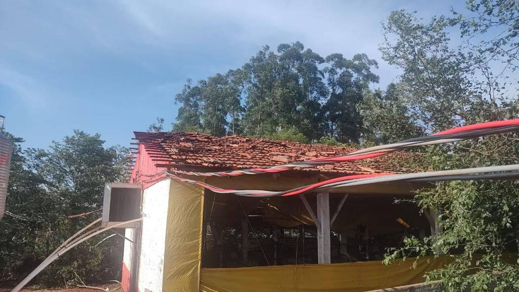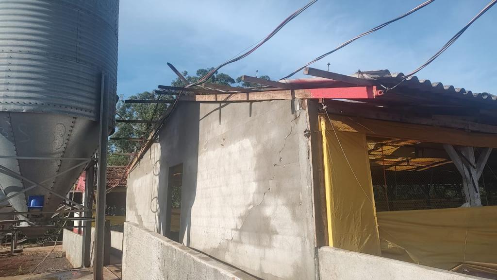 Na propriedade do produtor rural Joelmir Oliveira os prejuízos ainda estão sendo calculados, houve destelhamento na casa no barracão, árvores foram derrubadas e na estrutura das porcas criadeiras e leitões é visível a destruição com a força dos ventos (confira nas fotos).